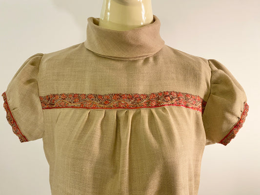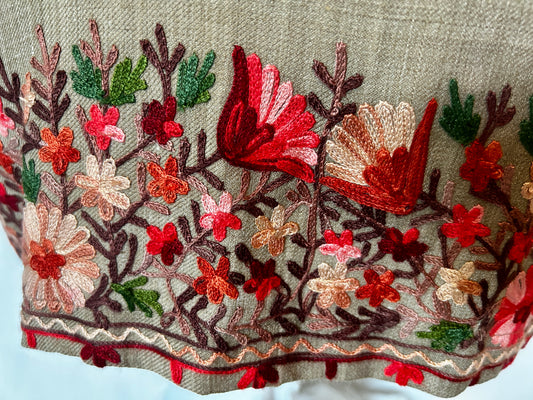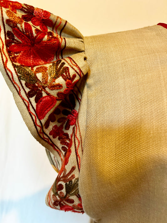 Calia Shawl Shirt in Tan Lambs Wool with Floral Kashmiri Embroidery