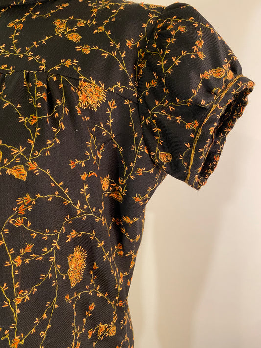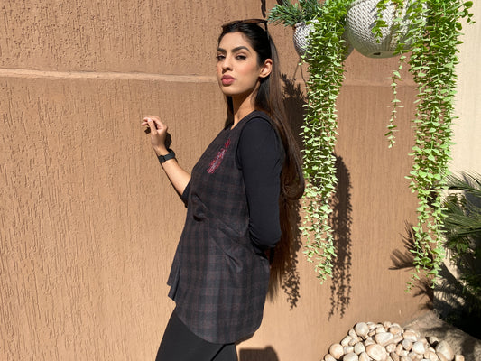 Begonia Top. Plaid pink & black tweed with hand-embroidery